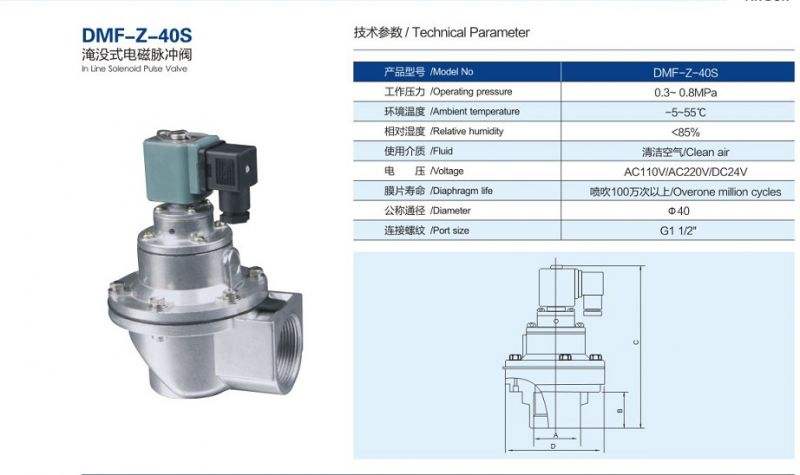 40S直角電磁脈沖閥為1.5寸脈沖閥,除塵器上常用來噴吹2.5米長布袋,噴吹布袋數(shù)量可以根據(jù)實際噴吹壓力和濾袋材質(zhì)來決定。