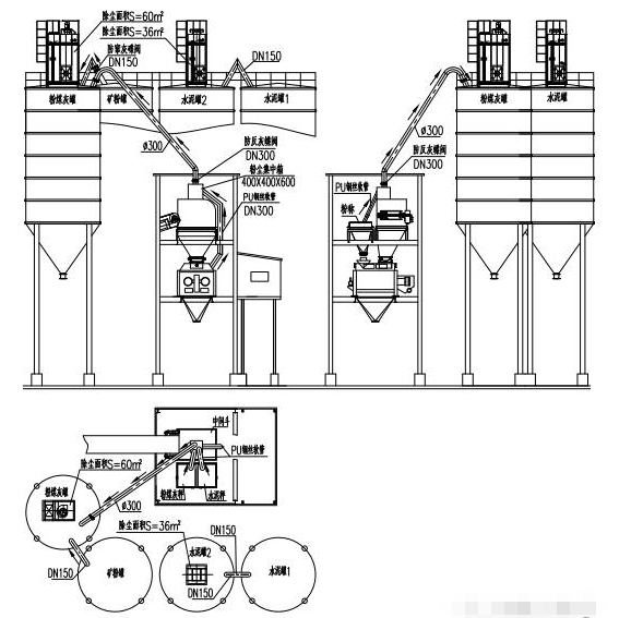 4、徹底解決主樓內(nèi)的生產(chǎn)揚塵問題。主樓生產(chǎn)過程中產(chǎn)生的粉塵,通過PU鋼絲軟管管道,集中至砂石待料倉頂部的粉塵集中箱,然后通過倉頂除塵器上的風(fēng)機和∮300管路,將粉塵全部抽到粉煤灰倉內(nèi),再經(jīng)過除塵器過濾反吹后直接落入粉煤灰倉。
